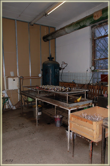 После серебрения (или как все же верно назвать этот процесс?) шарики плавно переходят в следующую комнату, где подвергаются процессу окрашивания. Опять таки ничего сложного, обычную паркетную краску (это то мы выяснили) с чем то смешивают (осталось в секрете), в полученную субстанцию опускают шарик и все Помешают заготовки в печь и начинается процесс сушки изделия...